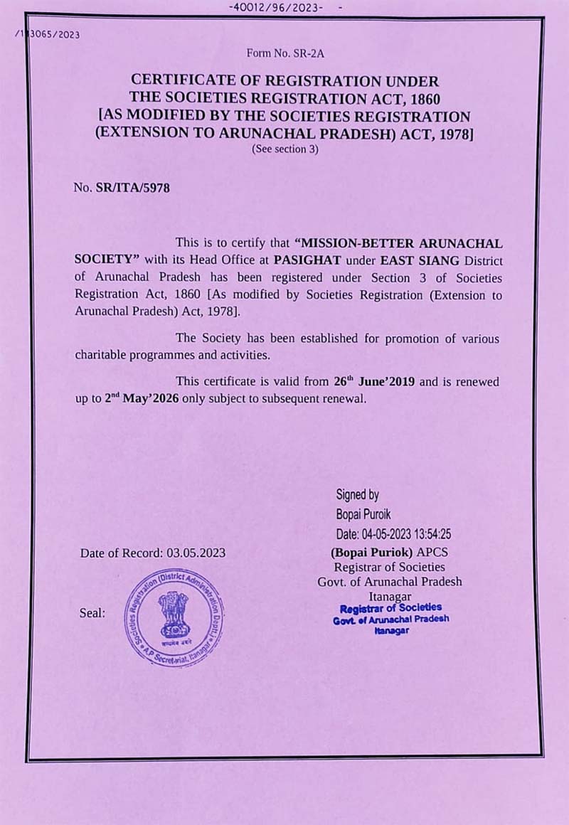 Documents Gallery MISSION-BETTER ARUNACHAL SOCIETY Registration Certificate Pan Card Society Memorandum
